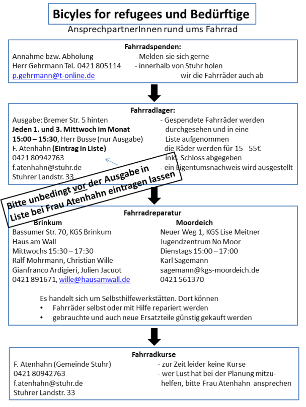 Wer ein Fahrad haben möchte, muss sich vorher beim Sozialen Service der Gemeinde Stuhr (Frau Atenhahn, Stuhrer Landstr. 33, Tel. 0421 80942763) registrieren lassen.